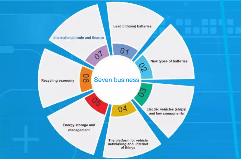 ມັນໄດ້ສ້າງຕັ້ງຂຶ້ນເຈັດພາກສ່ວນທຸລະກິດພະລັງງານໃຫມ່ໂດຍອີງໃສ່ຫມໍ້ໄຟ (lithium) , ຫມໍ້ໄຟໃຫມ່, ການເກັບຮັກສາແລະການຄຸ້ມຄອງ, ເສດຖະກິດວົງ, ຍານພາຫະນະໄຟຟ້າແລະເຮືອແລະອົງປະກອບທີ່ສໍາຄັນ, ເຄືອຂ່າຍຍານພາຫະນະແລະອິນເຕີເນັດຂອງເວທີ, ແລະການຄ້າແລະການເງິນສາກົນ. ພື້ນຖານສໍາລັບການພັດທະນາເຕັກໂນໂລຢີຂອງ Chilwee ໃນທົດສະວັດຕໍ່ໄປ.